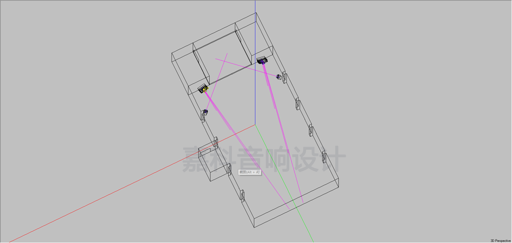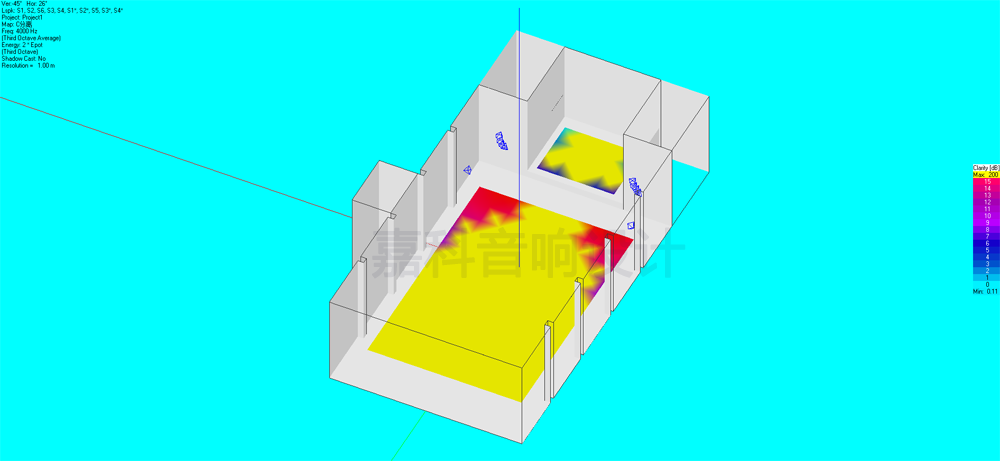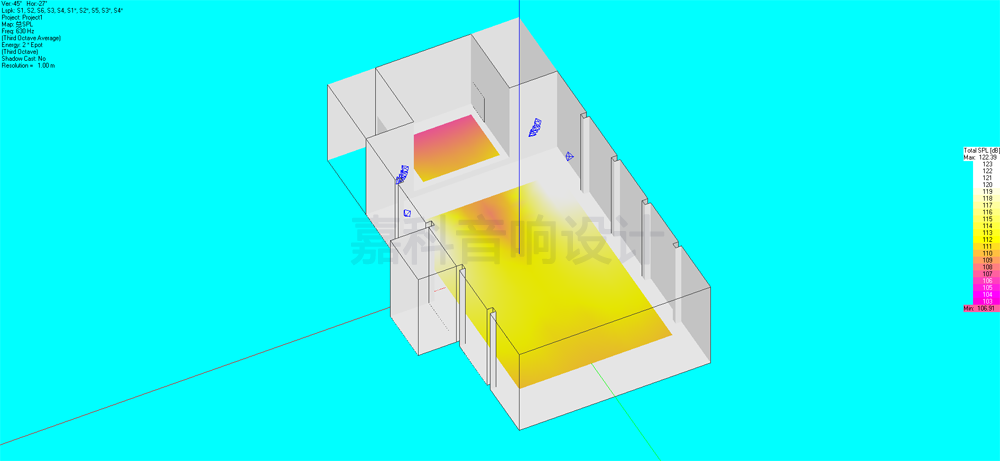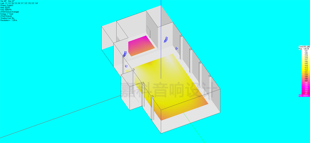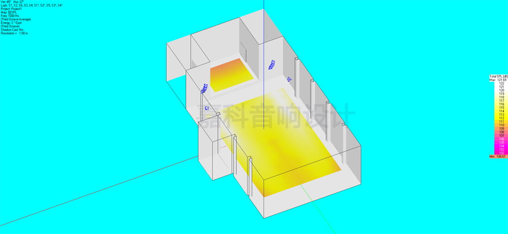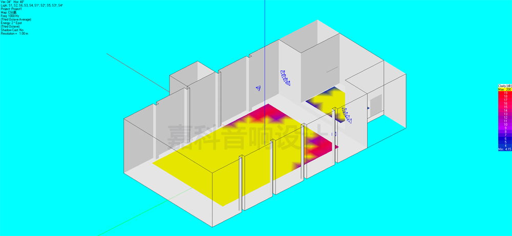 通過初步的設計計算確定黄色视频软件下载的數量和分布,黄色软件app大全免费下载2023這裏選用百威老字號品牌和設備清單上的型號。使用國際聲場模擬測試軟件EASE建立數學模型,將所選的黄色视频软件下载參數功率代入模型,通過聲場設計軟件,模擬計算相關聲學參數。根據行業標準測試結果令人滿意,聲場聲壓與聲場清晰度的測試結果均優良。