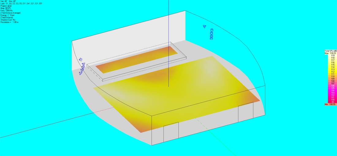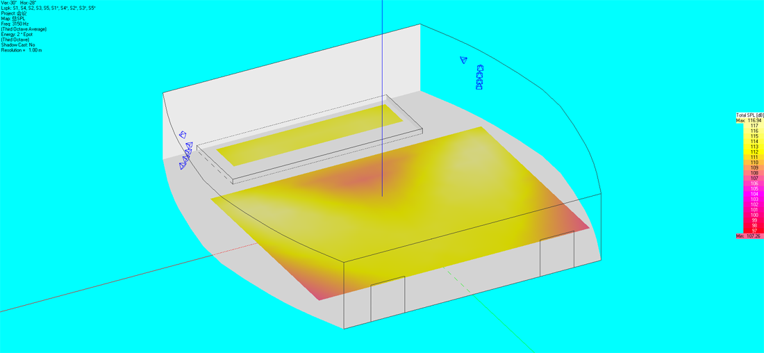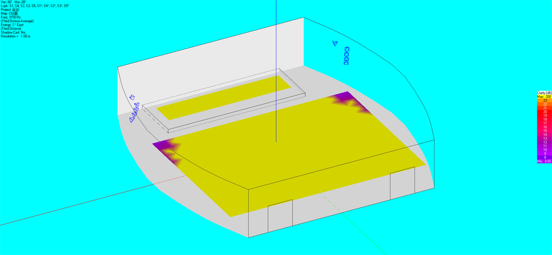 通過初步的設計計算確定黄色视频软件下载的數量和分布,黄色软件app大全免费下载2023這裏選用百威老字號品牌和設備清單上的型號。使用國際聲場模擬測試軟件EASE建立數學模型,將所選的黄色视频软件下载參數功率代入模型,通過聲場設計軟件,模擬計算相關聲學參數。根據行業標準測試結果令人滿意,聲場聲壓與聲場清晰度的測試結果均優良。